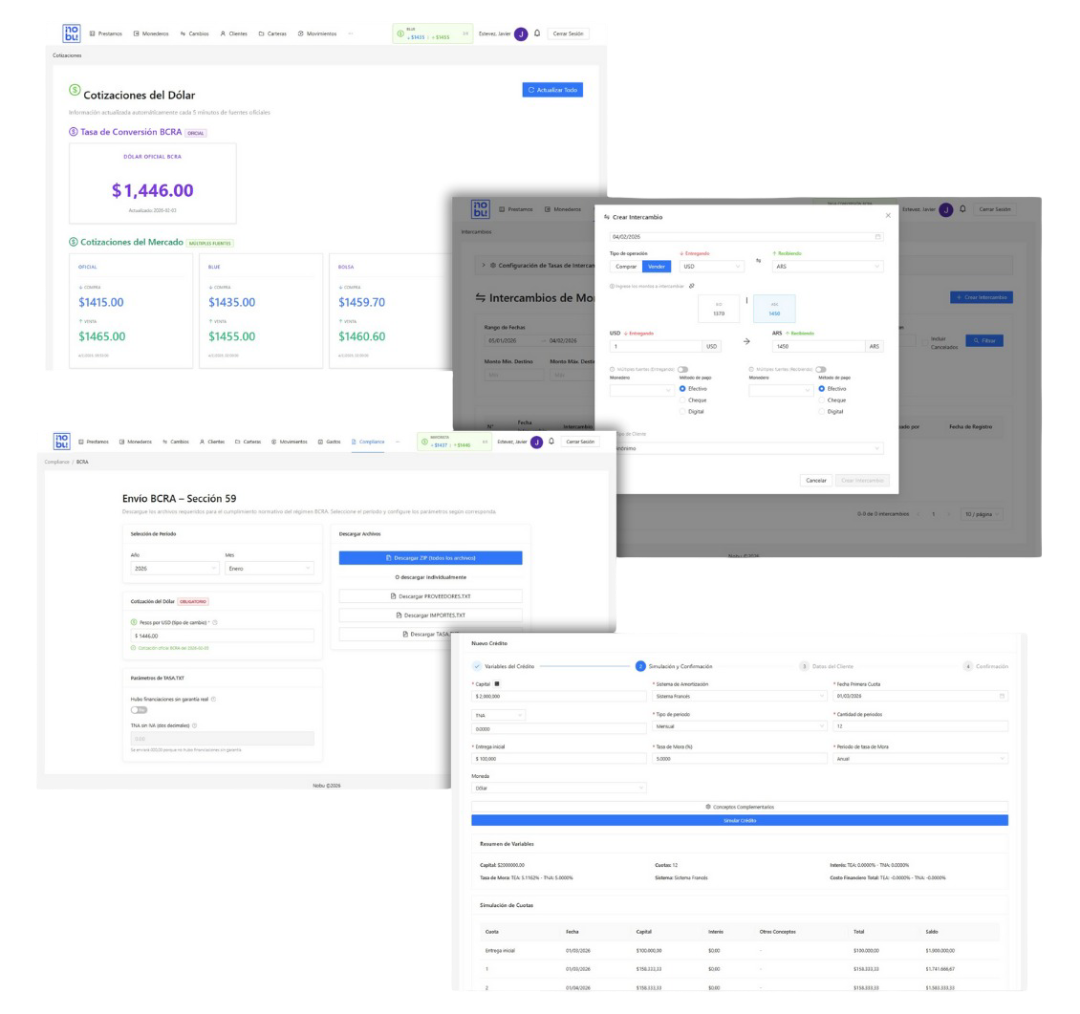 Gestión de préstamos, simuladores de créditos, inversiones, carteras y cobranzas con análisis de riesgo automatizado.